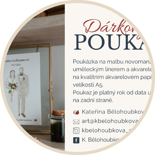 Pokud se nemůžete rozhodnout, co by udělalo vašim blízkým největší radost, napište mi o voucher. Může znít na malby ve vámi zvolené částce, nebo na konkrétní službu, třeba malbu novomanželů na A5.